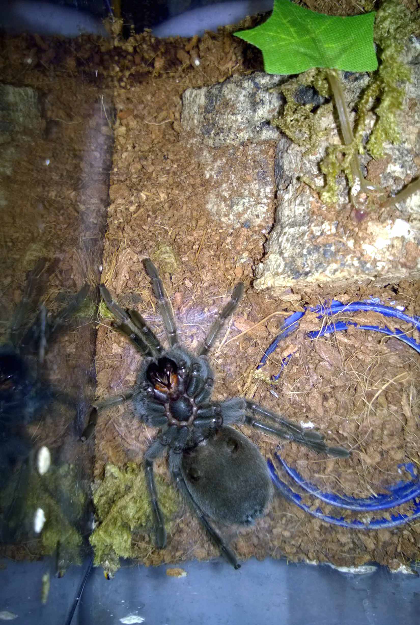 All three have webbed up their enclosures heavily. They are not particularly shy, and they have no problem sitting right out in the open waiting for prey. This is particularly nice, because this is a truly unique and beautiful tarantula. Haplalopus sp. Colombia is a very fast and skittish species, though, and they will bolt to their dens when disturbed. Care should be shown every time their enclosure is opened for feeding or maintenance.