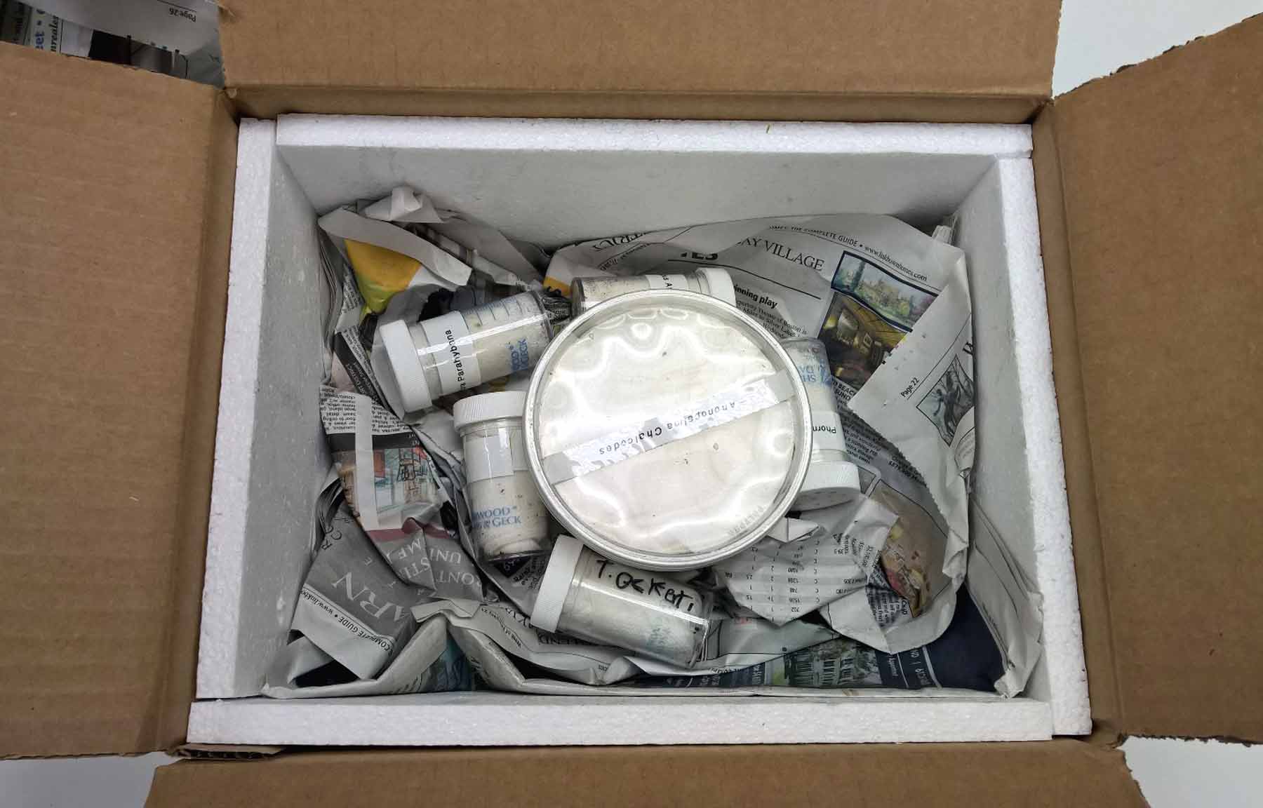 My spiders were expertly packed in a foam lined box with a heat pack included. I loved that the heat pack was securely taped to the top panel of foam, keeping it from shifting during transit and cooking the spiders. The five vials and one deli cup that contained my tarantulas were safely nestled in crushed newspaper; they would have been quite safe if the package had been jostled or dropped.