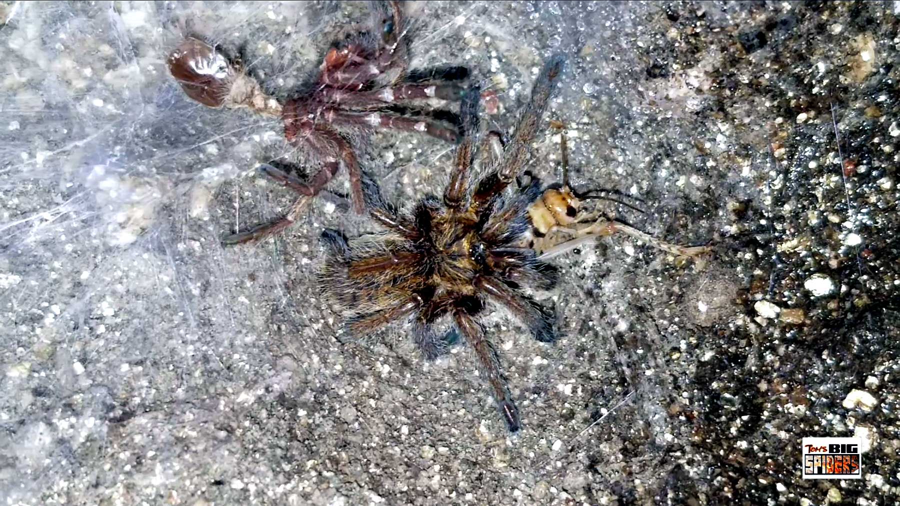 H. pulchripes femalePremolt is fairly easy to detect with slings if you spot them out of their dens. Their abdomens can become quite distended and shiny, and they will start refusing food. Most will also retreat to their burrows when in promolt, often webbing up the entrances. This is their way of putting up the “do not disturb” sign, so you should not try to open the burrow to check on them or to shove food in. During this time, keep a corner of the substrate moist, the water bowl full, and try not to disturb your sling. They will eventually reemerge a bit larger and quite hungry. For the shier species like H. baviana who do not come out of their dens much, look for the entrance to open and for them to deposit the old molt outside. This is usually another good indication that they have molted, hardened up, and are ready to eat.