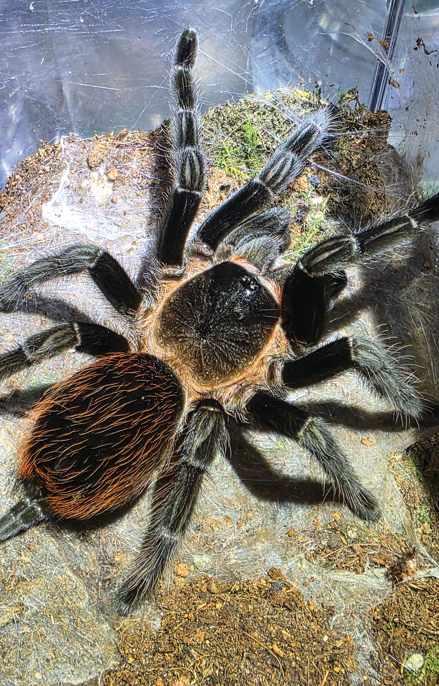 In December of 2016, I moved her into a large Critter Keeper with several inches of substrate and a hide. In retrospect, this enclosure didn’t really offer her much room for burrowing. She did excavate a bit under her cork bark hide, and again she would retreat to this area if disturbed. However, as she put on more size and hit around 5” (13 cm) or so, she abandoned her burrow and spent more time out in the open. To my surprise, she remained quite calm, rarely bolting or throwing any hairs. A few years later, I moved her into a Sterilite ClearView Latch container, which measures 17 x 11 x 6.5” (43 x 28 x 16.5 cm). She remains a very calm and visible spider that barely moves when I open her enclosure for feedings and maintenance. In fact, when I recently brought some spiders in to show the students in my Arachnid Appreciation Club, she was one of the ones that I brought.