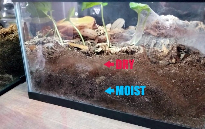 This one is actually quite easy. Moist substrate will always have a darker hue to it than dry substrate. Once the surface of moist substrate starts to dry out a bit, it will be paler in comparison to the lower levels of moist substrate. When that darker band shrinks below the halfway point of the total level of substrate, it’s time to remoisten.