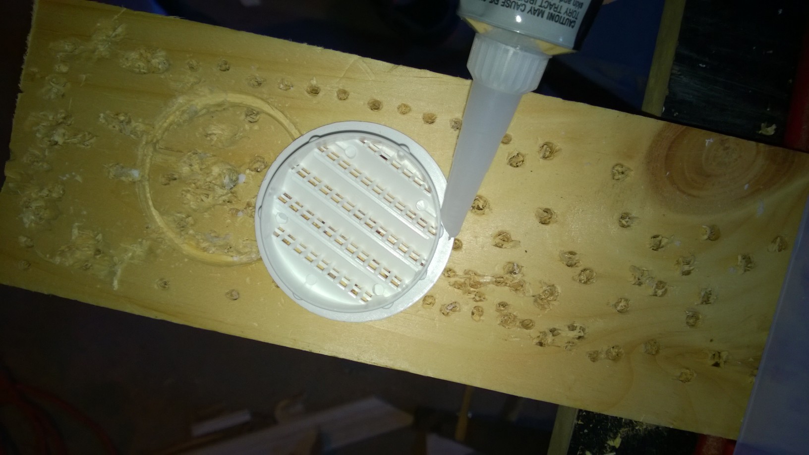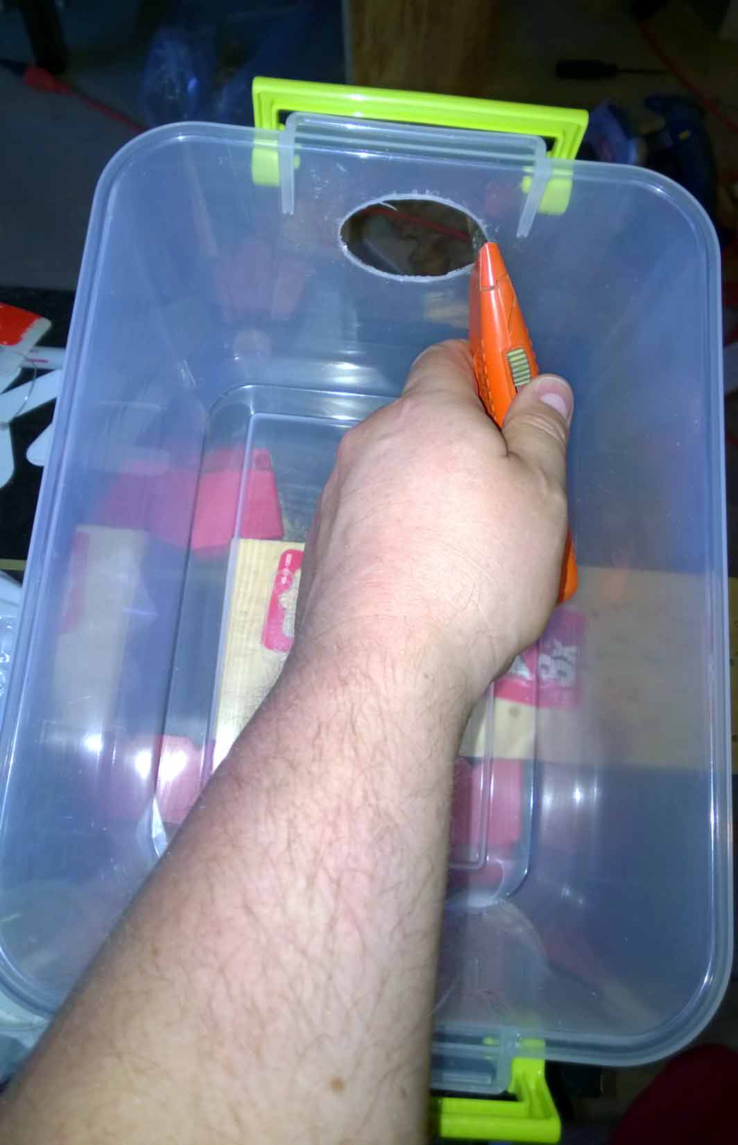 To install them, I just used a 3″ hole saw and my cordless drill to make a hole on either side of the container. I used hot glue around the edges then just popped them in. (Again, you can drill a series of holes, and it will serve the same purpose and cost a bit less).